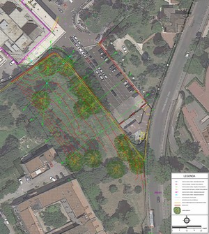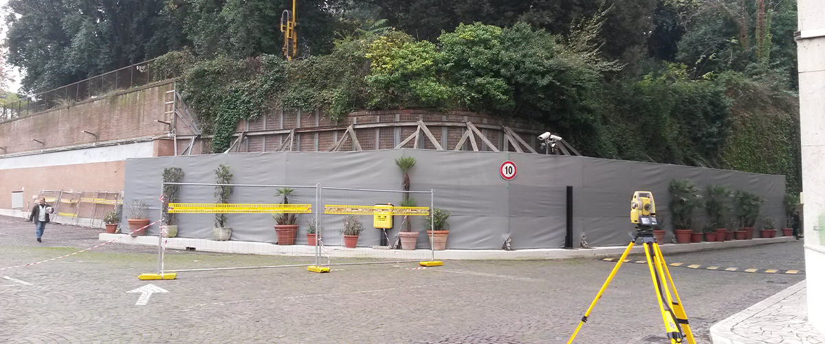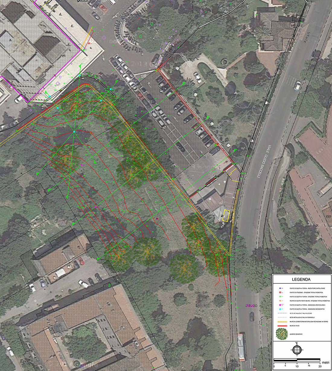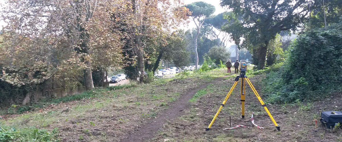 Rilievo plano-altimetrico eseguito tramite ricevitore satellitare G.N.S.S. in modalità RTK e Stazione Totale Robotica dello stato dei luoghi di una zona interna al complesso immobiliare della F.A.O. sito a Roma (RM) con individuazione dei sondaggi archeologici e geognostici con successiva rappresentazione planimetrica in ambiente CAD sovrapposta su idonea cartografia in scala 1:100, modello tridimensionale del terreno, curve di livello e sezioni sui punti di interessi definitivi con la committenza.