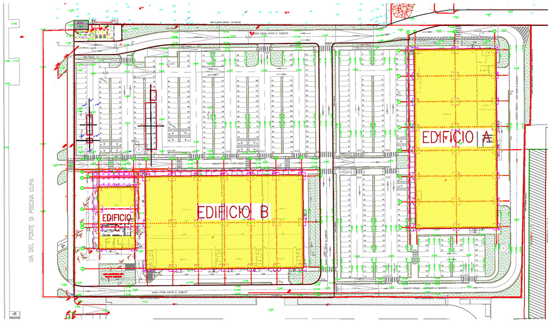Tracciamento in cantiere opere di urbanizzazione, fili fissi di plinti, pilastri e fondazioni speciali e successive verifiche in corso d’opera per la realizzazione di n°3 edifici e relativi corpi accessori. Cantiere sito in via del Ponte di Piscina Cupa – Castel Romano (RM) e successivo inserimento in mappa delle nuove linee dividenti e delle sagome degli edifici, restituzione informatizzata e redazione del tipo di frazionamento e mappale conforme alla circ. 2/88, tramite procedura informatizzata Pregeo;