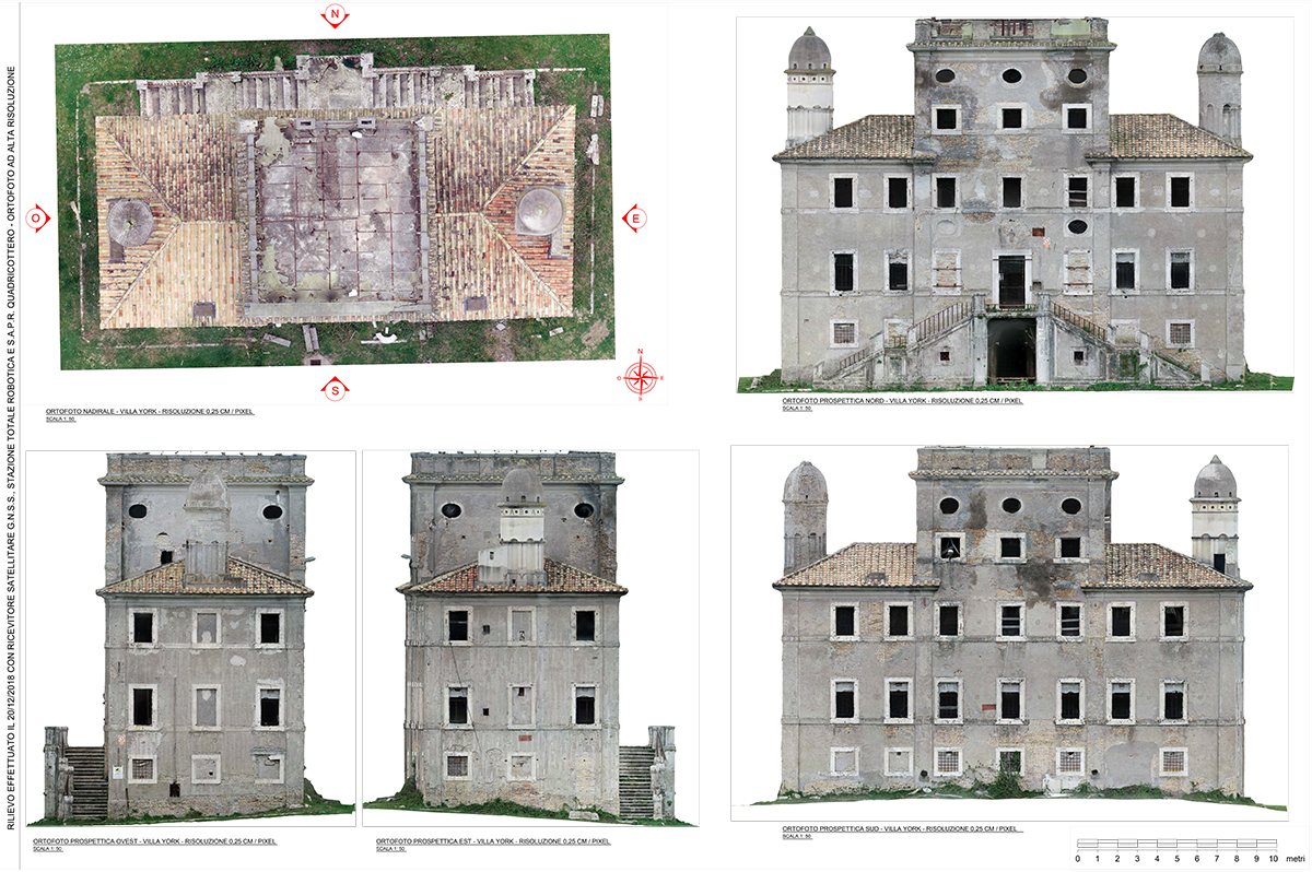 Produzione ortofoto prospettiche ad alta definizione (0.25 cm/pixel) dell’edificio principale (Villa York) e degli edifici accessori (Casali 1 – 2 – 3 – 4) con relativa importazione in ambiente CAD e redazione cartografia numerica 2D in scala 1: 100.