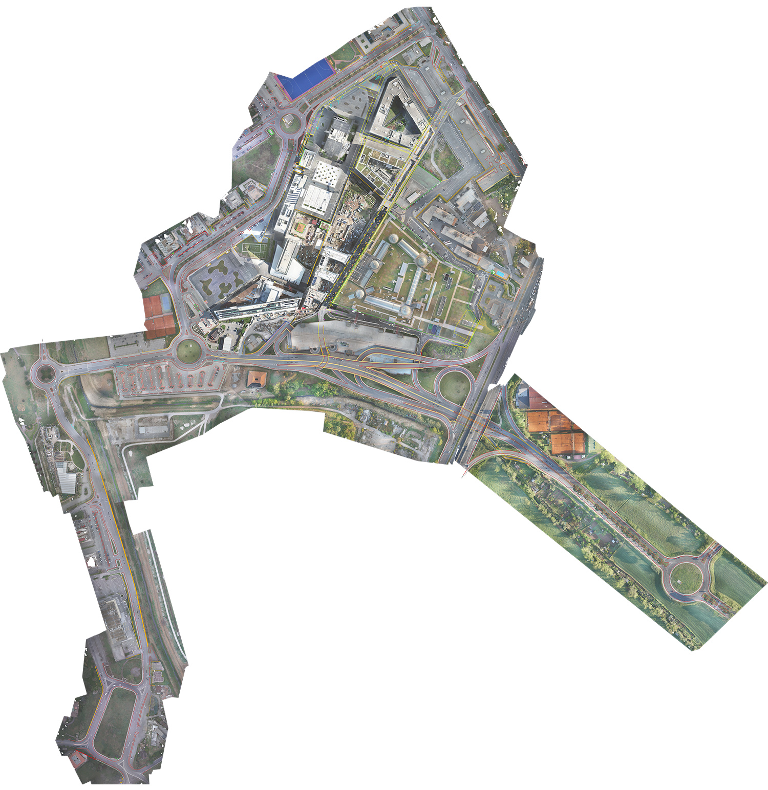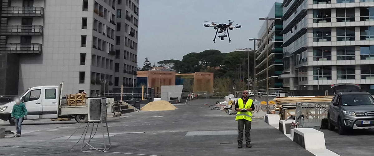 Rilievo aerofotogrammetrico effettuato tramite drone S.A.P.R. esacottero con fotocamera digitale 24 Mp, drone S.A.P.R. quadricottero con fotocamera digitale 20 Mp e ricevitore satellitare GNSS in modalità RTK eseguito a Roma (RM) – in località EUR per i seguenti tratti di strada: rotatoria via di Decima, via delle Comete, via D. Jachino - via di Decima - Via S. Delogu - Via G. Ribotta e Via Tolosa - Via P. Stefanini - Viale C. Levi e rotatoria P.zza G. Piovene, parte viabilità pubblica nel Centro Commerciale Euroma 2.