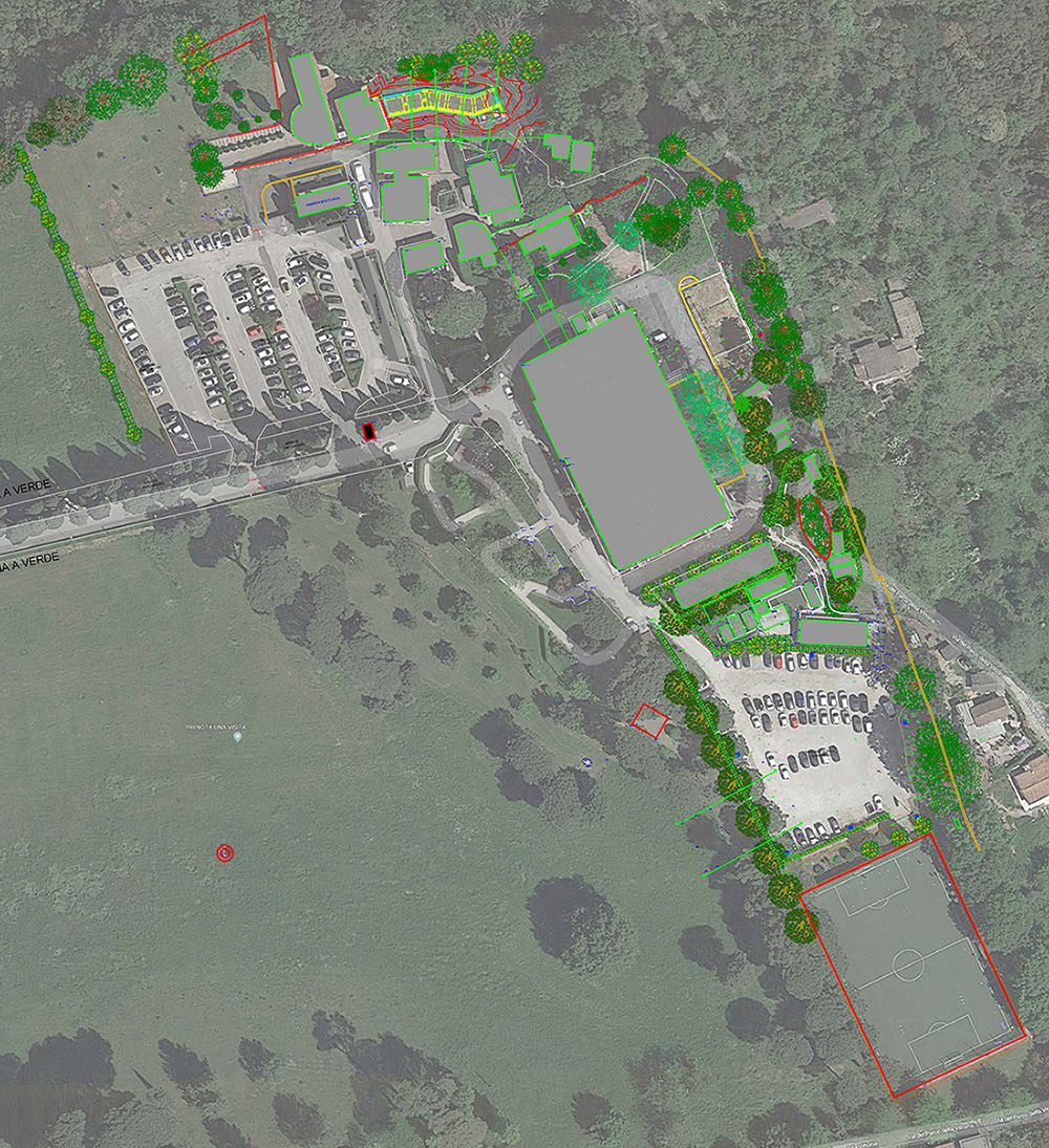 Rilievo plano-altimetrico eseguito tramite ricevitore satellitare G.N.S.S. in modalità RTK e Stazione Totale Robotica, per la determinazione dei punti di dettaglio dei confini definiti da murature e recinzioni, attualmente esistenti lungo alcuni lati del lotto, e relativo arredo urbano (sede stradale, murature e recinzioni, aiuole, marciapiedi. tombini, caditoie, rampe, illuminazione pubblica, accessi carrabili, segnaletica verticale ed orizzontale, sagome fabbricati ed alberature) con successiva rappresentazione planimetrica in ambiente CAD sovrapposta su idonea cartografia in scala 1:100;